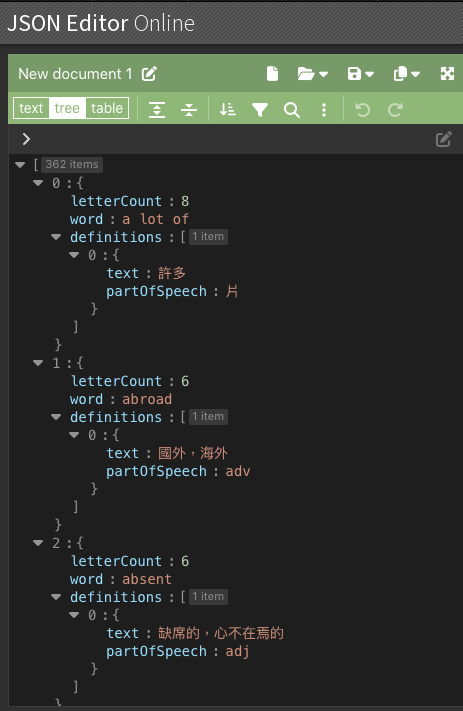 從 JSON Editor Online 網站上先查看了 JSON 資料樹狀圖: