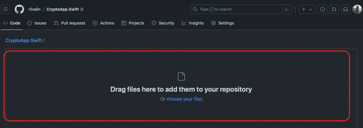 - Go to “CryptoApp.Swif” Repo > Tap on “uploading an existing file.” > Drap all files