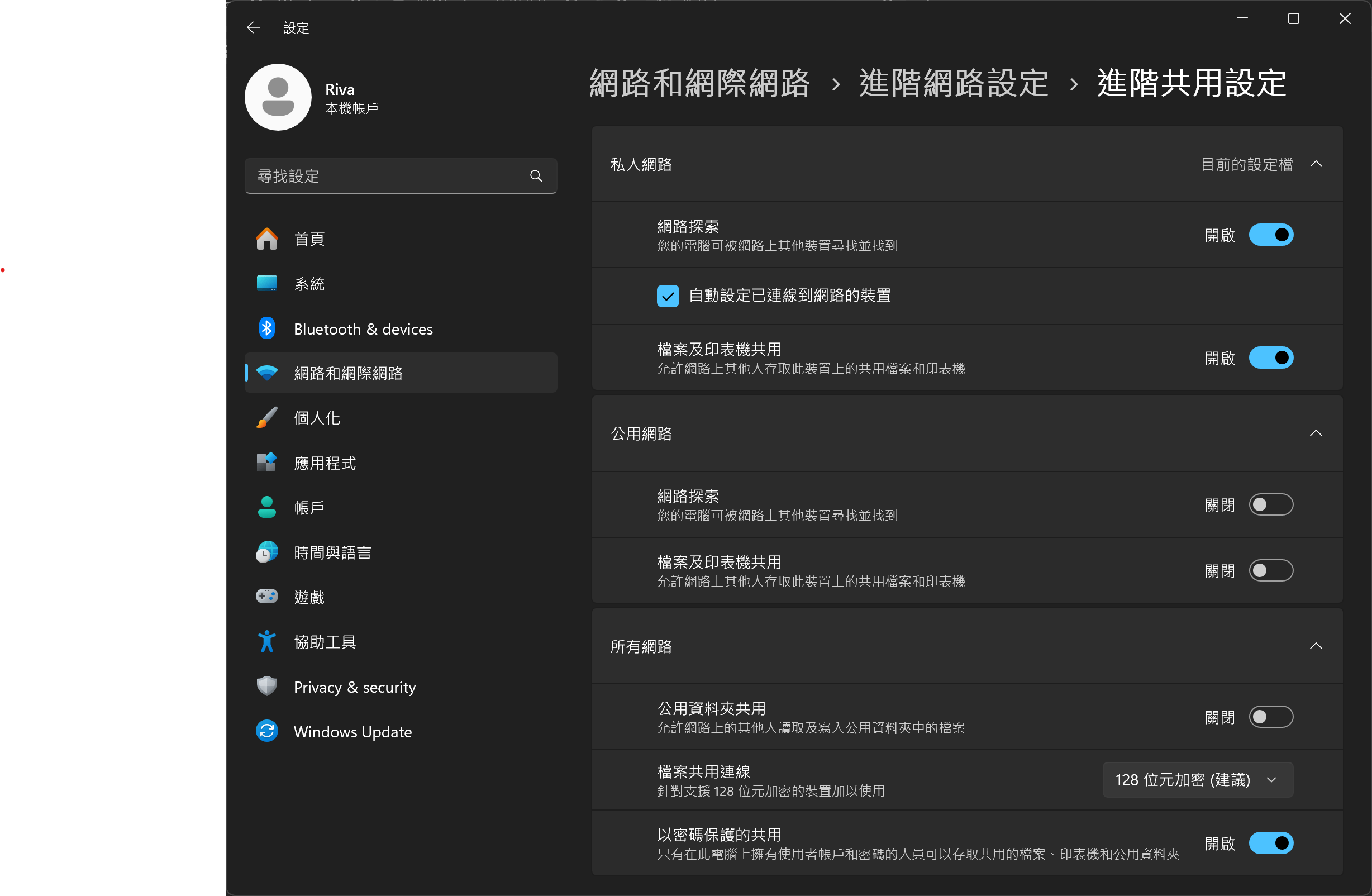 控制台 > 網路和網際網路 > 網路和共用中心 > 變更進階共用設定