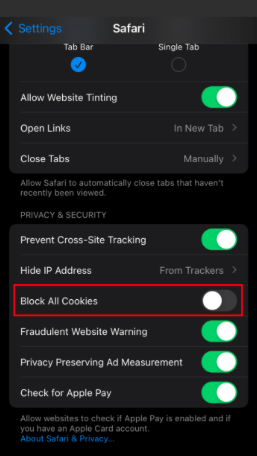 Click the button next to the “Block All Cookies” tab. When it’s in the OFF position, it’ll turn grey.