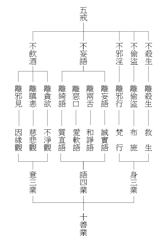 五戒配十善的情形,大致可以用下頁兩表說明: