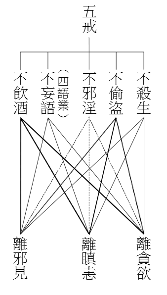 第一表中的飲酒戒,配合貪、瞋、邪見的三意業,似頗牽強,實則不然。依佛法說,酒有事酒與理酒之分。普通飲酒是有物質型態的事酒;因為酒的性質能夠使人昏沉糊塗而失去理智,所以凡為貪瞋愚癡的心理現象,亦皆稱為飲酒,那便是飲的無明煩惱的理酒,這要等到成佛之後,才能永不復飲。故此貪、瞋、邪見的三種意業,配為飲酒一戒,並沒有錯。